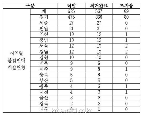 지역별로 보면 경기 지역이 전체의 76%인 476건으로 불법 전대건수가 가장 많았으며, 세종(27건), 전남(21건), 인천 및 충남(각 13건), 서울 및 경남(각 12건), 강원(10건) 등 순이었다.