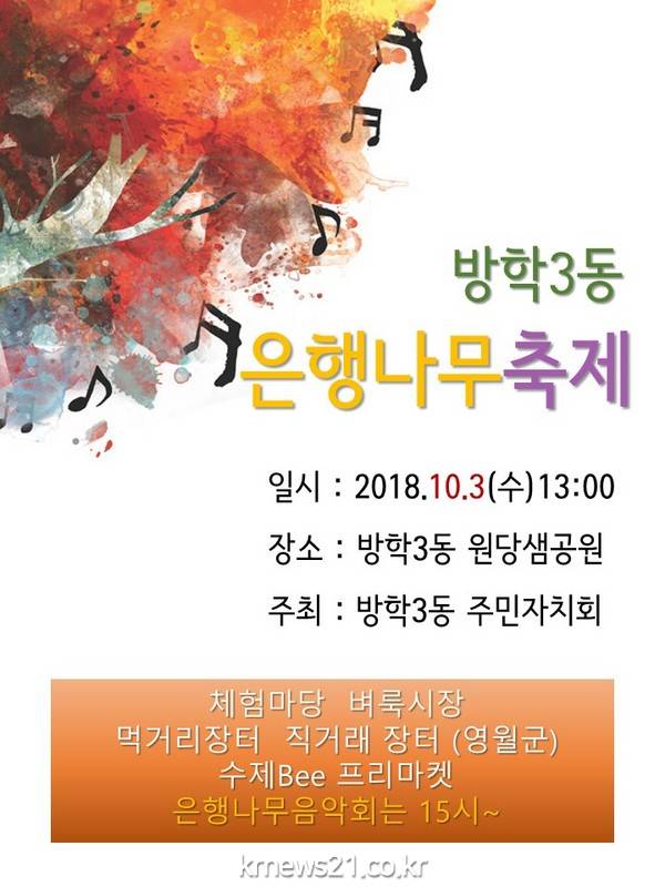 이번 ‘방학3동 은행나무 축제’는 사물놀이 공연을 시작으로, 방학3동 출신의 가수 진수경의 무대와 노래, 합창,우쿨렐레,바이올린 연주, 방송댄스 등의 공연을 선보이며 깊어가는 가을의 분위기를 이웃과 함께 즐길 수 있는 시간으로 마련된다.