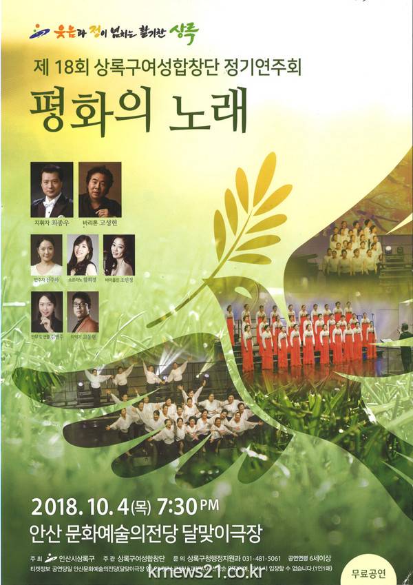 이날 무대는 상록구여성합창단의 ‘평화의 노래’을 시작으로 ‘인연’, ‘꽃구름 속에’ 등이 합창으로 펼쳐진다. 이어 소프라노 함희경의 공연과 바이올린 조민정의 연주, 바리톤 고성현의 ‘청산에 살리라’, ‘시간에 기대어’ 솔로 공연이 진행된 후 상록구여성합창단의 뮤지컬 메들리 합창으로 마무리 된다.