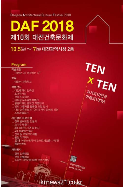 행사는‘TEN × TEN (과거의10년과 미래의100년)’을 주제로 ▲ 학술포럼 ▲ 어린이건축학교 ▲ 대전시 건축상 등 전시행사 (8종) ▲ 건축 및 주택 VR체험 등 시민참여행사(8종) ▲ 건축 취업상담 등 사회봉사(3종) 등 모두 21종의 프로그램이 진행된다.