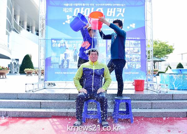 낮 기온이 20도를 밑돌 만큼 쌀쌀해진 날씨에도 불구하고 행사에 참가한 윤화섭 시장은 많은 시민이 지켜보는 가운데 얼음물을 뒤집어썼다.