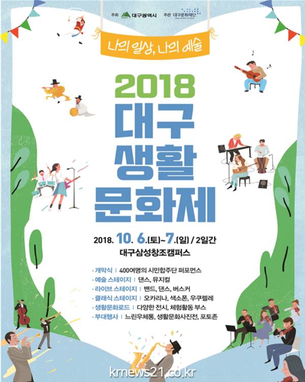 2018 대구생활문화제는 ‘나의 일상, 나의 예술’이라는 주제로 10. 6.(토) 오후 6시 30분 대구생활문화 동호인 400여명이 참여하는 시민대합주로 문을 연다.