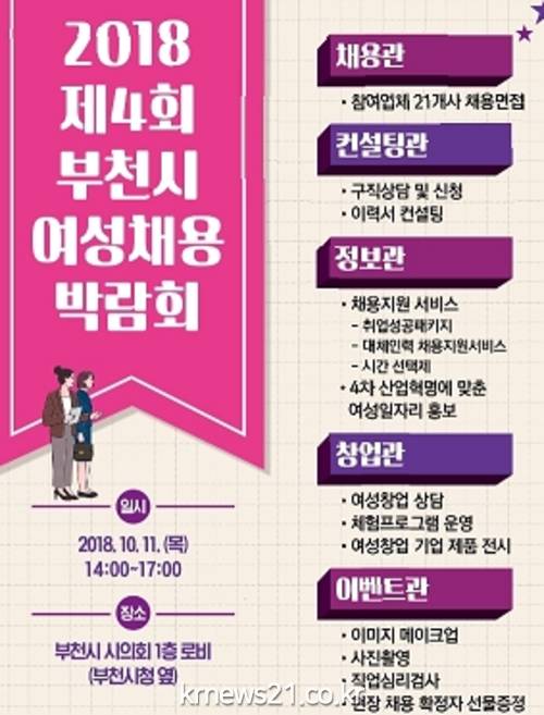 경기도, 부천시, 부천여성인력개발센터가 공동 주최하고 부천여성인력개발센터와 고용복지플러스센터가 주관하는 이번 행사에는 21개 업체가 참여해 100여 명의 여성을 채용할 계획이다.