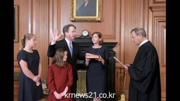 브렛 캐버노 미국 연방 대법관 후보가 6일(현지시간) 워싱턴DC 대법원에서 성경에 손을 얹고 취임 선서를 하고 있다. 캐버노는 성폭행 의혹으로 논란이 일었지만 이날 상원 본회의에서 인준을 통과했다.
