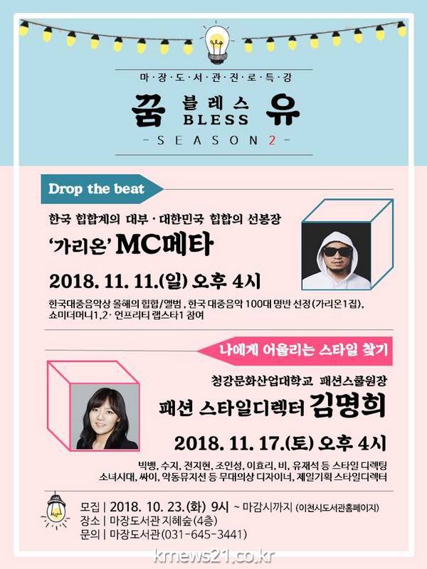 마장도서관 진로특강 시즌2는 11월 11일 일요일 오후 4시(MC메타), 11월 17일 토요일 오후 4시(김명희) 총 2차시로 운영되며, 10월 23일부터 이천시통합도서관 홈페이지를 통해 신청 가능하다. 특강에 대한 자세한 문의는 마장도서관(☎031-645-3441)으로 하면 된다.