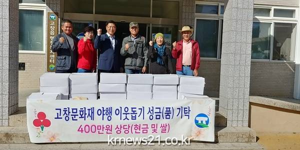(전북/뉴스21)김문기기자=고창문화재 야행 추진단(고창오거리당산제 보존회장 설태종)에서 어려운 이웃을 위해 써 달라며 성금 150만원과 250만원 상당의 백미를 고창읍행정복지센터에 기탁했다.