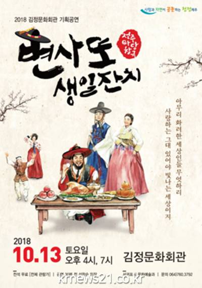 전주를 넘어 타 지역, 세계로 뻗어나가며 지역을 대표하는 브랜드 공연으로서 입지를 굳혀가고 있는 (재)전주문화재단(대표이사 정정숙) 한옥마을 상설공연단의 ‘전주마당창극 <변사또 생일잔치>’(이하 변사또)‘가 오는 10월 13일(토) 오후 4시와 7시, 제주도 서귀포시 김정문화회관에서 신명나는 잔치한마당을 연다.
