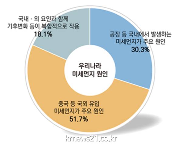 미세먼지의 발생 원인으로는 중국 등 국외유입(51.7%)으로 인식하는 비중이 가장 높았으며, 국내 발생 30.3%, 국내외·기후변화 등 복합적인 원인 18.1% 순으로 답했다.