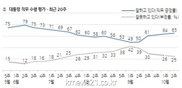 국정수행 지지율이 소폭 상승, 65%를 기록했다.