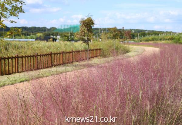 시는 우천 시 발생하는 오염물질을 줄이고자 올 4월 비점오염시설 내 181㎡ 규모로 4500본의 핑크뮬리 꽃을 심어 산책로를 만들었다.