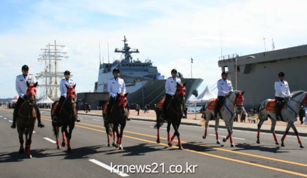 ▲ (사진=제주자치도청)제주도 자치경찰단 기마경찰대(단장 나승권)는 지난 10월11일부터 10월14일까지 4일간 제주 서귀포시 제주해군기지에서 열린 해군 국제관함식에 참가하여 기마 퍼레이드 및 포토존 운영 등 이색적인 볼거리를 제공했다.