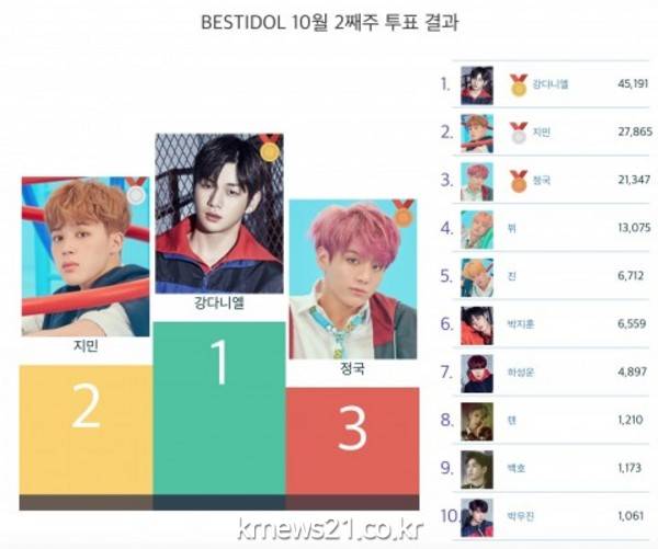 10월 2주차 TOP 5는 1위 강다니엘, 2위 지민, 3위 정국, 4위 뷔(방탄소년단), 5위 진(방탄소년단)이다. 강다니엘이 35주 연속 1위를 이어가는 가운데 지민과 정국이 치열한 2위 싸움을 벌였다. 진(방탄소년단)과 박지훈(워너원)의 5위 싸움 역시 치열했다.