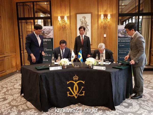 설명회에 이어 윤화섭 시장은 스웨덴에 본사를 둔 마리나 전문기업 SF-마리나 그룹의 군나르 오데(Lars Gunnar Odhe) 회장과 안산시 해양 레저 사업에 관한 1천억 원의 투자양해각서(MOU)를 체결했다.