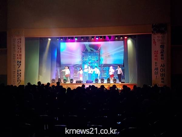 ▲ (사진=괴산군청)충북 괴산군 청소년상담복지센터 & 학교밖 청소년지원센터(센터장 유현)는 괴산국민체육센터에서 괴산군 학교폭력·사이버폭력·성폭력 예방을 위한 ‘괴산 뮤지컬 데이 No! Punch!’ 공연을 진행했다.