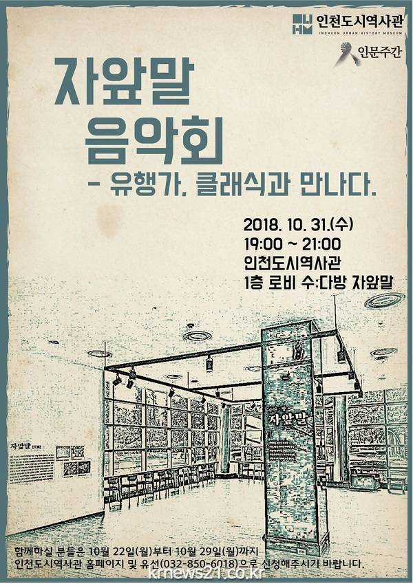 ▲ (사진=인천광역시청)인천도시역사관은 오는 31일 수요일 저녁 7시부터 인천 시민 100명을 대상으로 ‘자앞말 음악회’를 개최한다고 밝혔다.