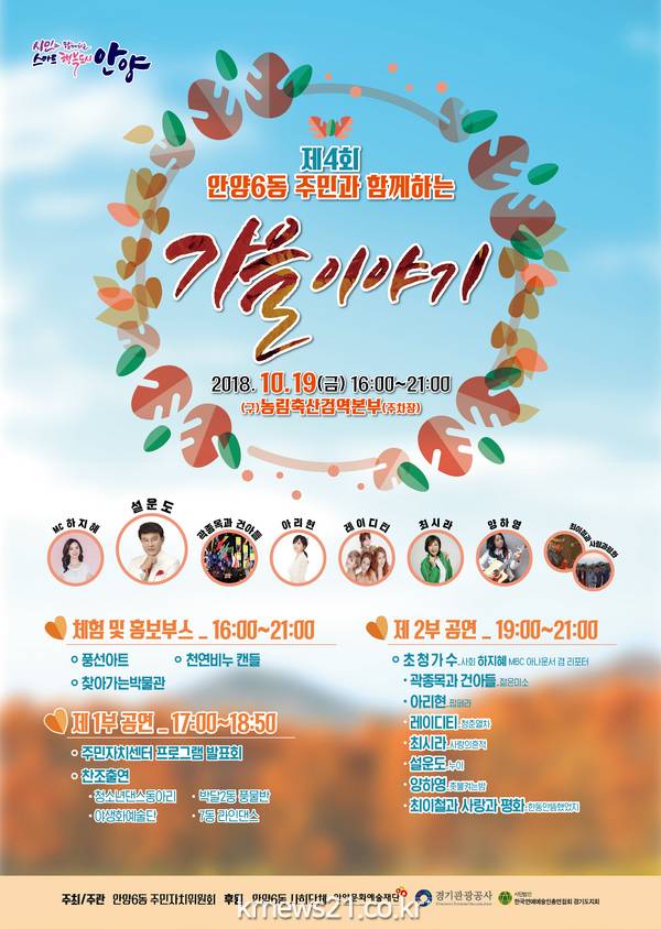 안양6동 행정복지센터(동장 이정순)는 오는 19일 오후 4시부터 9시까지 구)농림축산검역본부 주차장 특설무대에서 미니 콘서트‘제4회 가을이야기’를 개최한다.