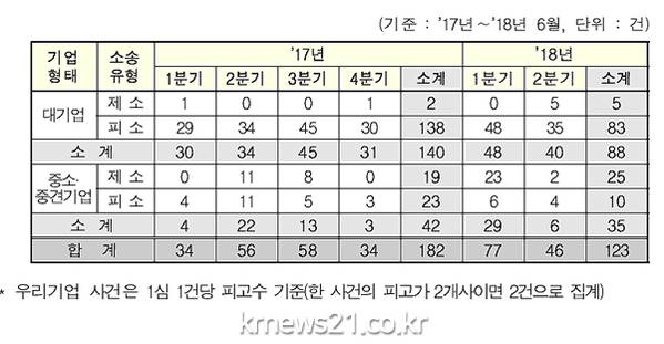 우리기업의 전체 특허소송 123건을 기업 유형별로 살펴보면 ▲대기업 88건 ▲중소·중견기업35건이었다.