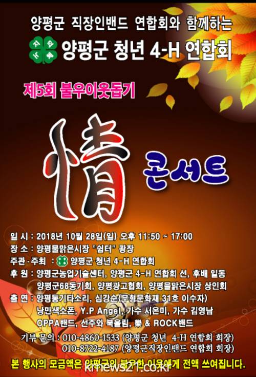 ▲ (사진=양평군청)양평군 청년 4-H 연합회와 양평군 직장인밴드연합회가 함께하는 “제5회 불우이웃돕기 情 콘서트”가 오는 10월 28일(일) 오전 12시부터 오후 5시까지 양평물맑은시장 쉼터광장에서 열린다.