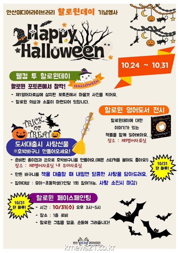 ▲ (사진=안산시청)안산미디어라이브러리(이하 라이브러리)는 ‘할로윈 데이’를 맞아 오는 24일부터 31일까지 도서전시를 비롯해 포토존, 페이스 페인팅 등으로 꾸며지는 ‘해피 할로윈(Happy Halloween)’을 진행한다.