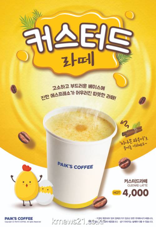 ▲ (사진=빽다방 홈페이지)더본코리아의 커피전문점브랜드 빽다방(대표 백종원)이 계란노른자로 만든 커스터드베이스와 진한 에스프레소가 만나 색다른 맛의 조화를 이루는 신 메뉴 ‘커스터드라떼’를 출시했다고 22일 밝혔다.