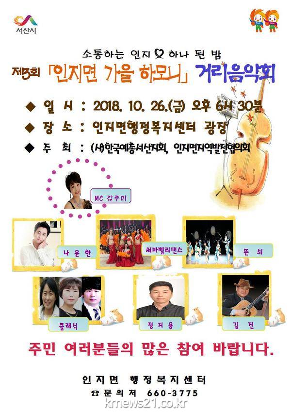 인지면행정복지센터에서는(면장 한명동) 오는 26일 오후 6시30분 인지면행정복지센터 광장에서 「인지면 가을하모니」를 주제로 거리음악회를 개최한다.