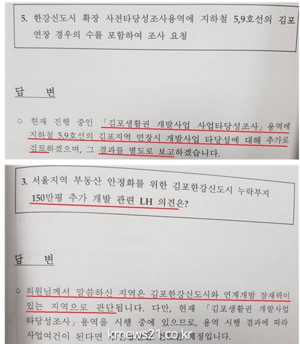 홍철호 의원은 이 같은 내용을 지난 11일 LH공사 국정감사에서 강력히 요구한 바, LH공사는 홍철호 의원에게 “현재 진행 중인 용역에 지하철 5·9호선의 김포지역 연장시 개발사업 타당성에 대하여 추가 검토하겠으며 그 결과를 별도로 제출하겠다”고 보고했다.