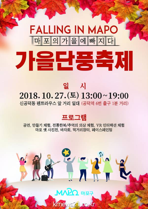 올해 처음으로 개최되는 마포구의 ‘가을 단풍 축제’는 ‘Falling in Mapo, 마포의 가을에 빠지다!’를 부제로 정하고 완연한 가을의 정취를 느낄 수 있도록 다양한 공연과 체험 프로그램 등을 시민들을 위해 준비했다.