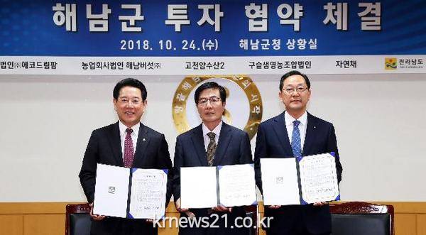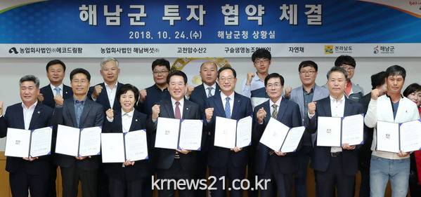 전라남도와 해남군은 24일 해남군청에서 농수축산물 가공공장을 건립하는 5개 기업과 총 290억 원을 투자해 200여 명에게 새로운 일자리를 창출하는 투자협약을 체결했다.