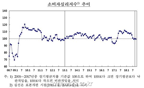 ▲ (사진=한국은행)한국은행이 26일 발표한 ‘2018년 10월 소비자 동향조사 결과’에 따르면 이달 소비자심리지수(CCSI)는 99.5로 한 달 전보다 0.7포인트 떨어졌다.