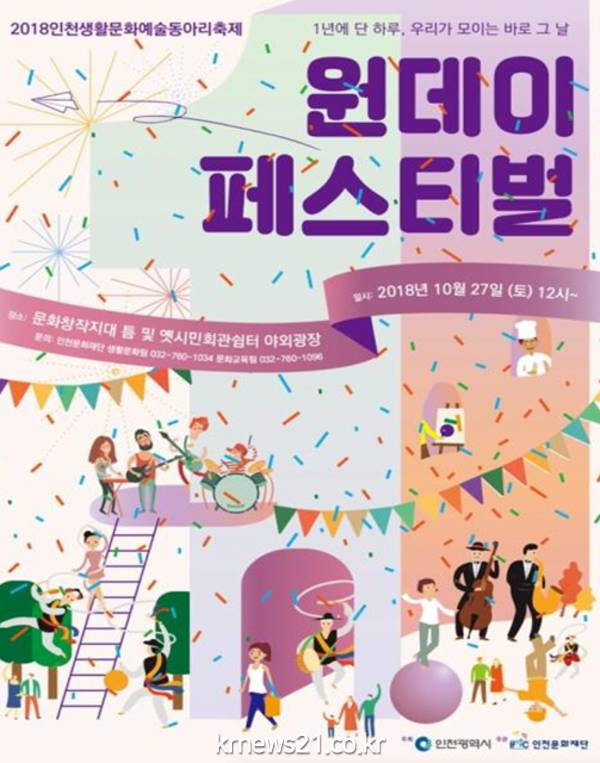 ▲ (사진=인천광역시청)인천광역시(시장 박남춘)는 오는 27일 주안 옛 시민회관 쉼터 야외광장과 문화창작지대 틈(인천지하철 2호선 시민공원역 1번출구)에서 인천지역 생활문화동아리 62개팀 500여명이 참석하는 생활문화예술동아리 축제 ‘원데이페스티벌’을 개최한다.