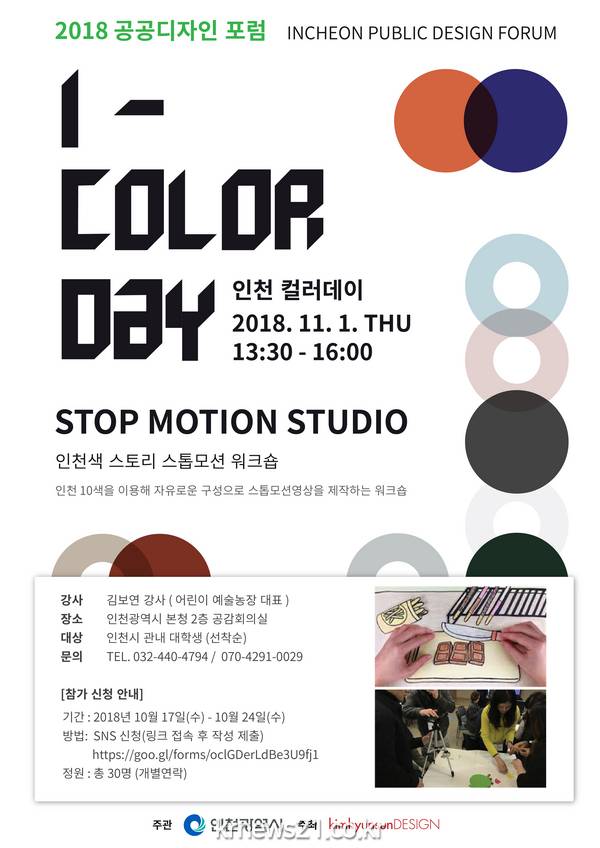시청 공감회의실에서 함께 진행되는 스톱 모션 제작 워크숍은 인천 색의 스토리를 가지고 스톱 모션 영상을 제작하는 방식으로 사전에 신청한 관내 대학생 30여명이 참석한다. 워크숍에서 제작한 스톱 모션 영상은 인천 색 홍보를 위하여 다양하게 사용될 예정이다.참여신청은 온라인(https://goo.gl/forms/oclGDerLdBe3U9fj1) 또는 이메일(khsd6789@ korea.com)로 10월 26일부터 접수하면 된다. 선착순 마감 후 확정 여부를 개별적으로 통보할 예정이다.