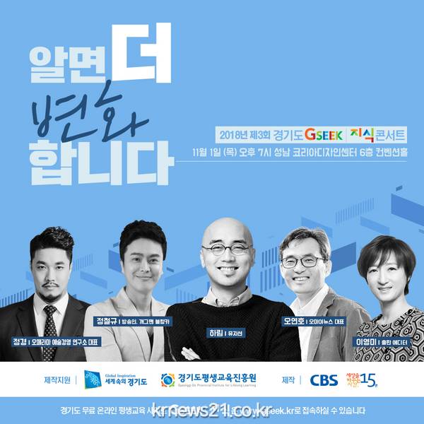 경기도와 경기도평생교육진흥원이 도민들의 공감과 소통의 장을 마련하고자 ‘알면 더 변화합니다.’를 주제로 개최하는 ‘경기도 지식(GSEEK) 콘서트’는 도내 31개 시·군을 순회하는 강연회로 CBS ‘세상을 바꾸는 시간, 15분’과의 협업을 통해 진행된다.