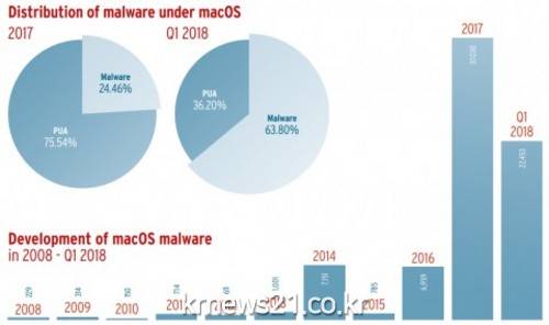 글로벌 보안 제품 테스트 기관인 AV TEST에서 매년 발표하는 보안 보고서(Security Report 2017/18)에 따르면 2017년 새로 발견된 애플용 멀웨어(Malware)는 무려 3만 7030개 이르며, 이는 2016년에 조사된 6959건 대비 370% 증가한 수치다. 최근 10년 동안 macOS용 멀웨어는 꾸준히 증가하고 있는 상태다.