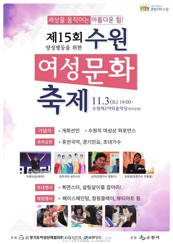 여성의 권익향상과 양성 평등문화 확산을 위한 ‘제15회 수원 여성문화축제’가 11월 3일 오후 2시부터 장안구 만석공원 제2 야외음악당에서 열린다.