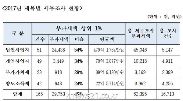 세목별 세무조사현황을 보면 법인사업자 5,147건에 대해 조사한 결과 상위 1%인 51개 법인이 세금탈루를 통해 부과된 세액(가산세 포함)은 2조 4,438억원이며, 법인사업자 총 부과세액의 54%를 차지하고 있으며, 개인사업자 세금탈루 상위 1%인 49명에게 부과된 세액은 3,449억원으로 개인사업자 부과세액의 34%를 차지하고 있다.