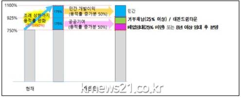 완화용적률로 발생할 개발이익금 일부에 대해 공공에 제공하는 계획을 포함해 민간 제안으로 지구단위계획을 수립할 경우, 용적률을 완화 받을 수 있으며, 앞으로 광역철도 및 도시철도 2호선 개통 상황에 따라 단계별로 확대할 방침이다.