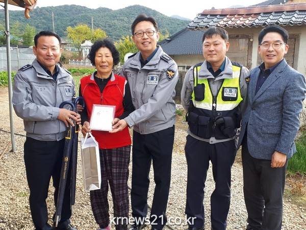 고창경찰서(서장 김성재)는 치매노인의 실종으로 경찰이 치매노인을 발견하기 위하여 마을 주변을 수색하는 것을 목격한 이웃마을 주민의 남다른 관심으로 치매노인을 발견, 경찰에 신고한 민간인에 대해 감사장을 수여했다.