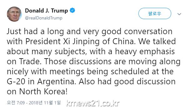 이어 "아르헨티나에서 열리는 G20 회의에서 예정된 회담을 통해 논의가 멋지게 이어질 것"이라고 밝혔다. 그는 "북한에 대해서도 역시 좋은 논의가 있었다"라고 덧붙였다.