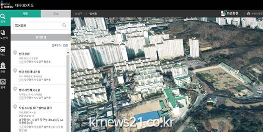 3D 지도는 인터넷으로 접속하여 대구 전지역을 입체적으로 살펴볼 수 있고, 시간과 계절에 따른 일조권, 조망권 등의 경관분석과 표고‧면적‧경사도 등의 측정이 가능하다.
