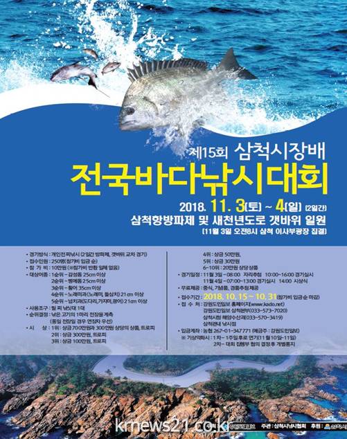 삼척시가 후원하고 강원도민일보가 주최, 국민생활체육 삼척시낚시연합회가 주관하는 전국 바다낚시대회는 전국 낚시동호인 등 250명이 참가할 예정이다.