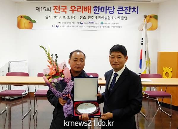(전북/뉴스21)김문기기자=정읍시농업기술센터(소장 문채련, 이하 농업기술센터)는 지난 2일 강원도 원주시 하나로클럽에서 개최된 ‘제15회 전국 우리 배 한마당 큰잔치(이하 우리 배 큰잔치)’에서 정읍배연구회장인 박건중(한얼농장) 씨가 최고품종상을 수상하였다고 알렸다.