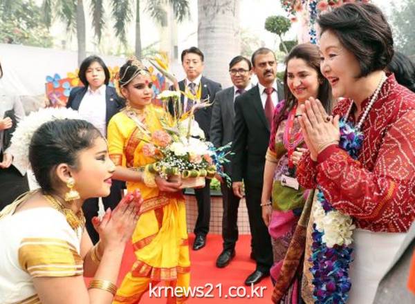 ▲ (사진=청와대)인도 총리의 공식 초청으로 인도를 방문 중인 문재인 대통령의 부인 김정숙 여사는 5일(현지시간) "시성 타고르의 시처럼 인도와 함께 한국이 '아시아의 등불'이 될 영광의 시대가 오리라 믿는다"고 말했다.