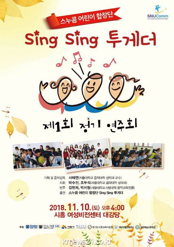 시흥시(시장 임병택)는 서울대 사범대학과 함께 오는 10일 오후 4시 시흥여성 비전센터 대 강당에서 SNUComm 어린이 합창단 ‘Sing Sing 투게더’ 제1회 정기공연을 개최한다.