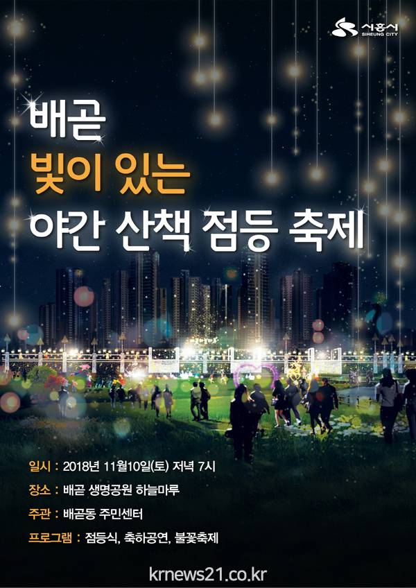 배곧동 주민센터(동장 최병호)는 오는 10일 저녁 6시30분부터 8시30분까지 배곧생명공원에서 ‘배곧, 빛이 있는 야간 산책 - 점등 축제’를 개최한다.