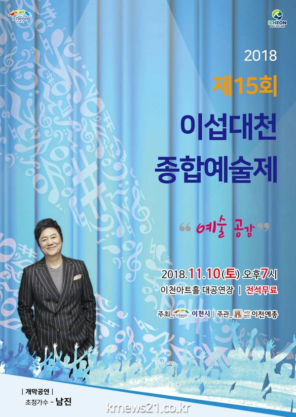 제15회 이섭대천 종합예술제 개막식은 10일‘예술 공감’이라는 주제로 진행될 예정이며, 오후 7시 이천 음악제를 시작으로 인기 트로트가수 남진의 개막 초청공연이 열릴 예정이다.