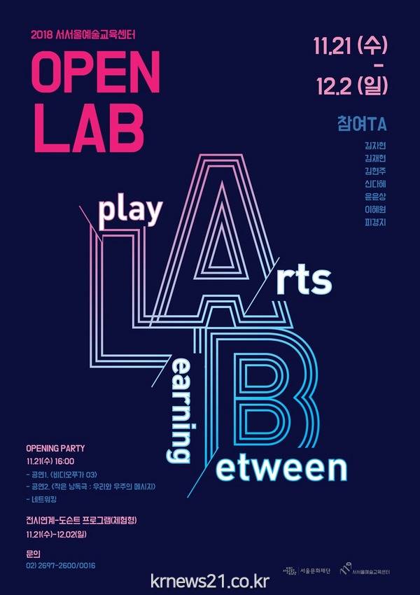 <오픈랩(OPEN LAB)> 기획 전시는 2018년 서서울예술교육센터 상주형 예술가 7명이 참여한 예술교육 연구개발 프로그램 ‘Arts LAB(예술놀이랩)’의 결과를 공유하는 자리다. 예술가와 참여자가 예술을 통해 만나는 관계 속에서 일어나는 예술의 ‘놀이적 형식 실험’을 예술가 7인의 시선으로 만날 예정이다.