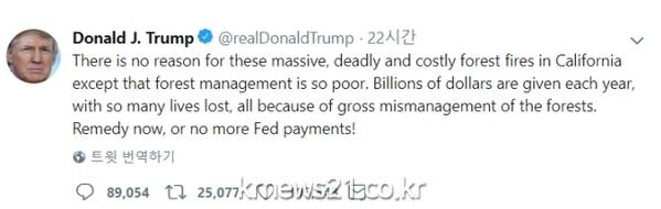 캘리포니아 주정부의 산림 관리 부실을 지적하면서 연방정부로부터의 지원금은 없을 것이라는 취지의 트윗을 남겼기 때문이다.