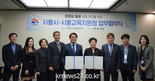 경기도 시흥교육지원청(교육장 조은옥)은 기초지방자치단체를 중심으로 지역사회의 다양한 자원을 활용하여 초등돌봄 서비스를 제공하는‘온종일 돌봄 생태계 구축’ 선도사업 추진을 위해 11월 13일 시흥시청과 업무협약을 체결하였다.