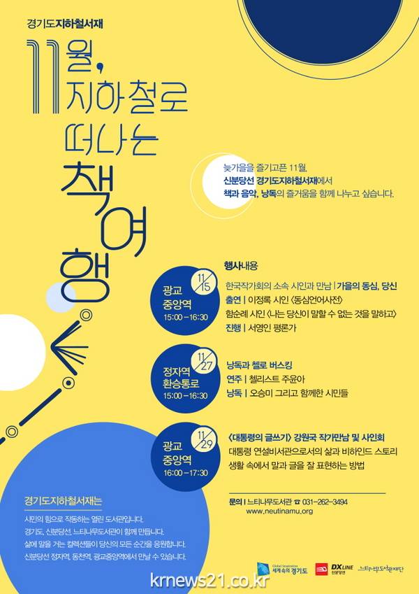 이번 지하철 서재 행사를 일자별로 살펴보면, 먼저 15일 오후 3시 광교중앙역 대합실 지하철 서재에서 열리는 첫 번째 행사는 시인 이정록과 함순례의 낭독회로, 평론가 서영인이 사회를 맡는다. ‘가을의 동심, 당신’이란 주제에 걸맞게 낭독과 더불어 시에 얽힌 에피소드, 삶에 대한 다채로운 이야기를 나눌 예정이다.