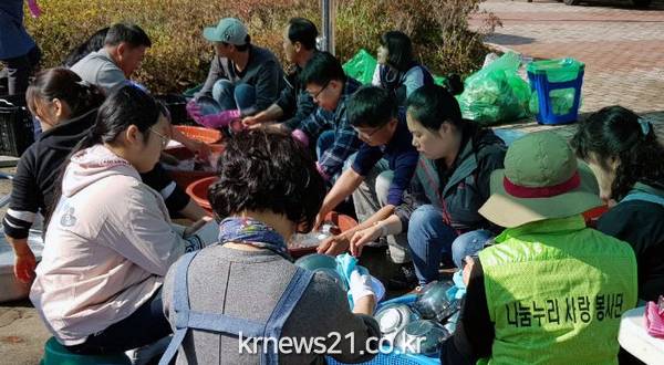 (△지난 10일 여수시청 봉사단 희망풍차팀이 성산공원에서 어르신 무료급식 봉사를 실시한 후 설거 지를 하고 있다.)